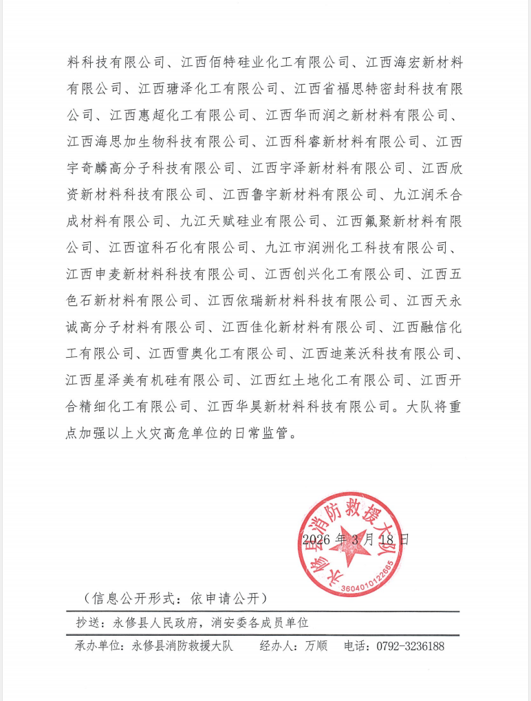 其中,属于火灾高危单位的有64家:永修县铜锣湾国际中心、赣江中心城金融中心、永修县人民医院、江西福荣国际大酒店、永修县陆欣酒店有限公司(全季酒店)、江西蓝星星火有机硅有限公司、江西联合化工有限公司、卡博特蓝星化工(江西)有限公司、江西利君欣科技有限公司、江西汇和化工有限公司、江西雁浔硅材料股份有限公司、江西秀康威达新型材料有限公司、江西华昊化工有限公司、江西硅博化工有限公司、江西麦豪化工科技有限公司、江西科隆科力新材料有限公司、江西海多有机硅材料股份有限公司、江西新嘉懿新材料有限公司、江西大山科技有限公司、江西福特化工新材料有限公司、江西福莱仕打火机制造有限公司、永修县艾科普新材料有限公司、九江市通元化工有限公司、江西东方巨龙化工有限公司、江西华特电子化学品有限公司、瓦尼迈阿密(江西)化工有限公司、江西星火狮达科技有限公司、江西恒毅科技有限公司、江西众和生物科技有限公司、厦门林德气体(江西)有限公司、永修县诚翔气体有限公司、江西星火航天新材料有限公司、九江飞尚科技有限公司、江西拜乐新材料科技有限公司、江西佰特硅业化工有限公司、江西海宏新材料有限公司、江西瑭泽化工有限公司、江西省福思特密封科技有限公司、江西惠超化工有限公司、江西华而润之新材料有限公司、江西海思加生物科技有限公司、江西科睿新材料有限公司、江西宇奇麟高分子科技有限公司、江西宇泽新材料有限公司、江西欣资新材料科技有限公司、江西鲁宇新材料有限公司、九江润禾合成材料有限公司、九江天赋硅业有限公司、江西氟聚新材料有限公司、江西谊科石化有限公司、九江市润洲化工科技有限公司、江西申麦新材料科技有限公司、江西创兴化工有限公司、江西五色石新材料有限公司、江西依瑞新材料科技有限公司、江西天永诚高分子材料有限公司、江西佳化新材料有限公司、江西融信化工有限公司、江西雪奥化工有限公司、江西迪莱沃科技有限公司、江西星泽美有机硅有限公司、江西红土地化工有限公司、江西开合精细化工有限公司、江西华昊新材料科技有限公司。大队将重点加强以上火灾高危单位的日常监管。