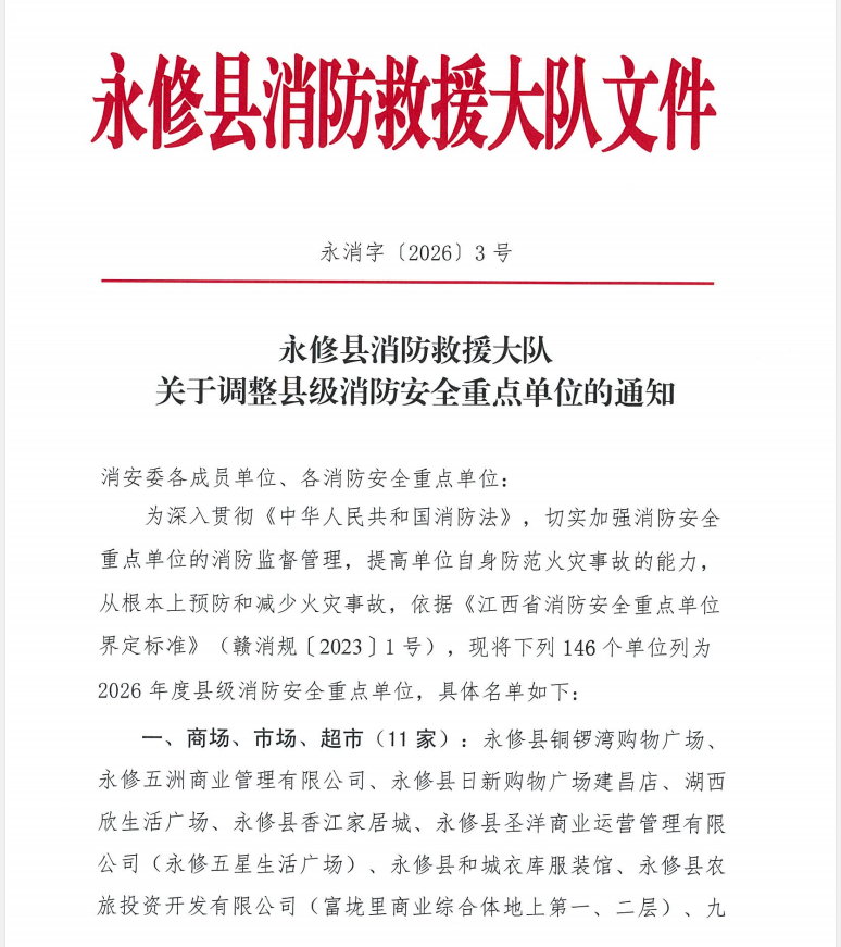 为深入贯彻《中华人民共和国消防法》,切实加强消防安全重点单位的消防监督管理,提高单位自身防范火灾事故的能力,从根本上预防和减少火灾事故,依据《江西省消防安全重点单位界定标准》(赣消规〔2023〕1号),现将下列146个单位列为2026年度县级消防安全重点单位,具体名单如下: