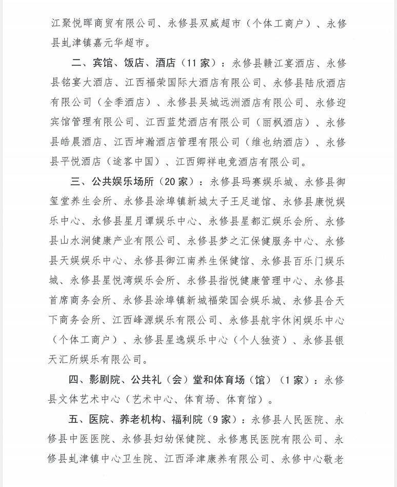 二、宾馆、饭店、酒店(11家):永修县赣江宴酒店、永修县铭宴大酒店、江西福荣国际大酒店有限公司、永修县陆欣酒店有限公司(全季酒店)、永修县吴城远洲酒店有限公司、永修迎宾馆管理有限公司、江西蓝梵酒店有限公司(丽枫酒店)、永修县皓晨酒店、江西坤瀚酒店管理有限公司(维也纳酒店)、永修县平悦酒店(途客中国)、江西卿祥电竞酒店有限公司。