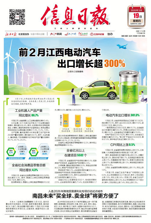 3月17日,江西省统计局公布2026年1月至2月全省经济运行数据。总体来看,1月至2月,全省经济运行稳健,实现平稳开局。