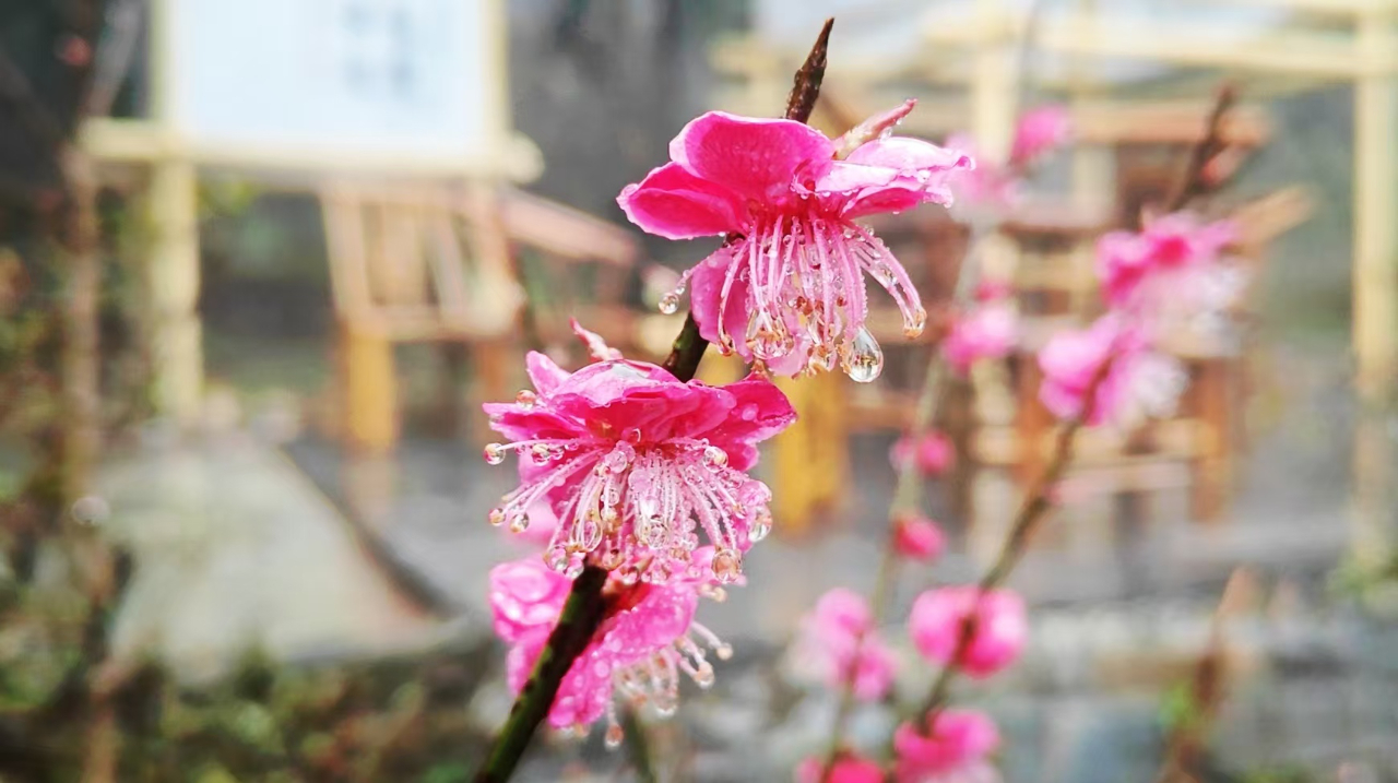 春雨打湿了台阶,周边樱花正值花期,粉嫩的花瓣沾着雨珠,簌簌落在青石板上,落在茅檐前,像一场粉色的梦迹。