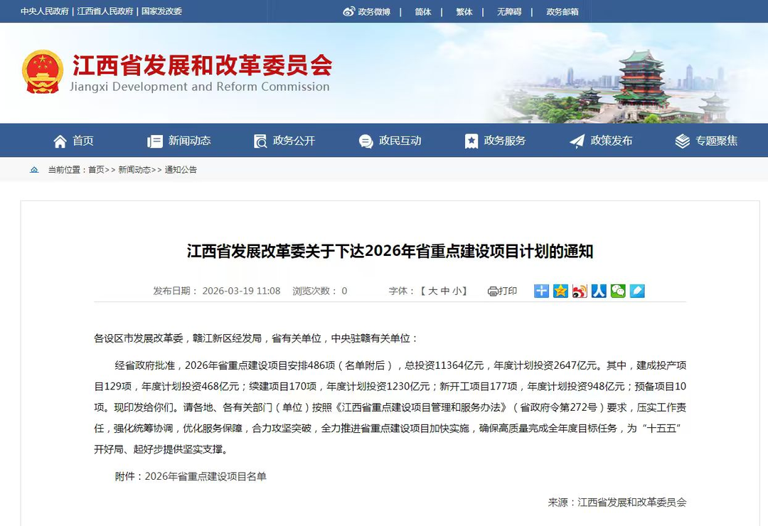 3月19日,江西省发展和改革委员会正式印发《关于下达2026年省重点建设项目计划的通知》,为全省“十五五”开好局、起好步注入强劲动力。