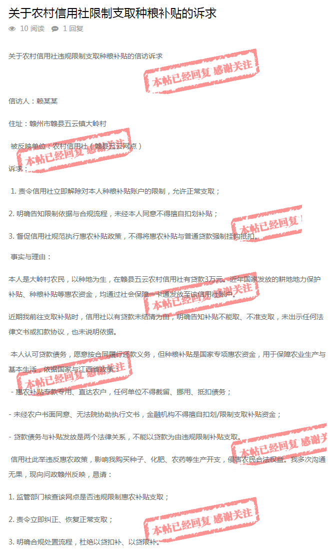 我认可贷款债务,愿意按合同履行还款义务,但种粮补贴是国家专项惠农资金,用于保障农业生产与基本生活。信用社此举违反惠农政策,影响我购买种子、化肥、农药等生产开支,侵害农民合法权益。