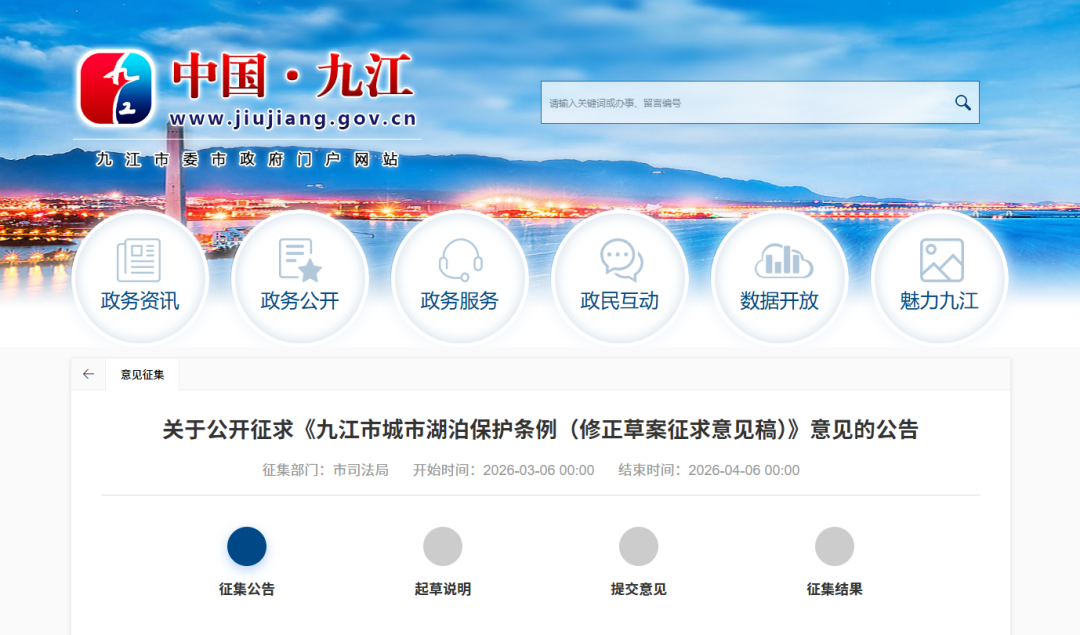 为深入践行科学立法、民主立法理念,广泛吸纳社会公众参与立法过程,凝聚社会共识,提高立法质效,保障《九江市城市湖泊保护条例》修正的科学性与合理性,现将《九江市城市湖泊保护条例(修正草案征求意见稿)》面向社会公开征求意见。如对修正草案征求意见稿有修改意见和建议,请于2026年4月6日前,通过以下途径向我们反馈。