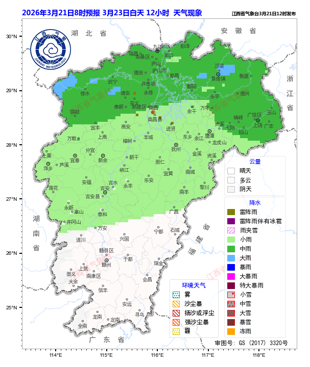 23日赣北阴天有中雨或雷阵雨,局部地区有大到暴雨;赣中阴天,部分地区有小到中雨或雷雨;赣南多云间阴天,局部地区有阵雨或雷阵雨。