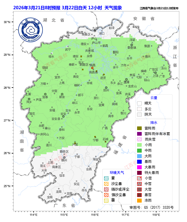 22日赣北阴天有阵雨或雷阵雨,局部地区有中到大雨;赣中阴天间多云,部分地区有阵雨或雷阵雨;赣南多云间阴天,局部地区有阵雨或雷阵雨。