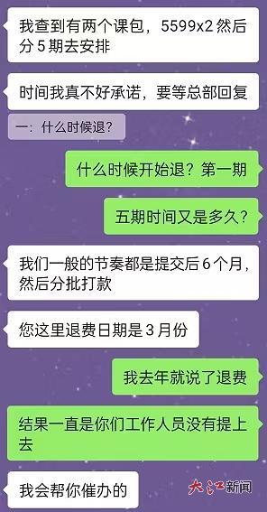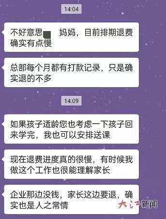 张女士提供的聊天记录显示,申请退费时,瑞思英语客服曾表示“退费确实有点慢”,并称“总部每个月都有打款,但整体进度不多”,未明确具体退款时间。