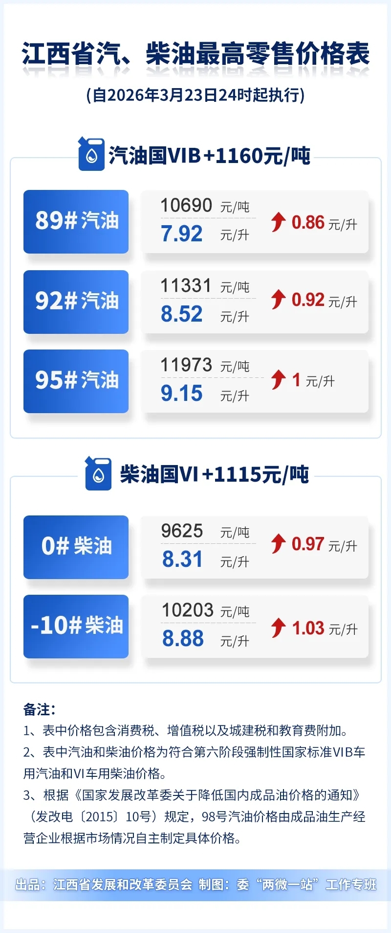 大江新闻讯 江西日报全媒体记者董文涛报道:3月23日,省发展改革委发布关于成品油价格调整的通告:根据国家发展改革委门户网站发布的成品油价格调整信息,现将我省汽、柴油最高零售价格公布如下,自2026年3月23日24时起执行。