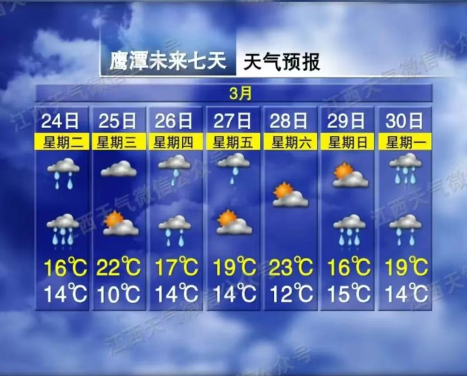 鹰潭市气象台2026年03月24日05时11分发布暴雨蓝色预警信号:预计未来12小时内,鹰潭市高新区、贵溪市、余江区、月湖区、龙虎山风景区、信江新区的部分地区降水可达50毫米以上,局地伴有雷电、短时强降水等强对流天气,请注意防范强降雨可能引发的城乡内涝、中小河流洪水、山洪和地质灾害等次生灾害。