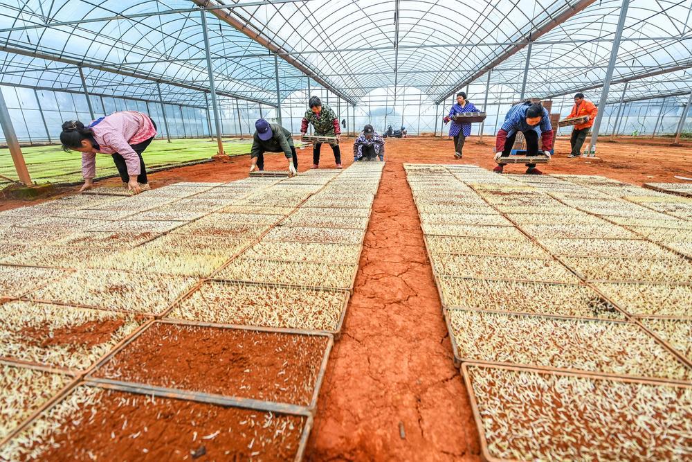3月20日,樟树市义成镇刘家村村民在标准化育秧中心搬运育秧盘,进行早稻集中育秧作业。