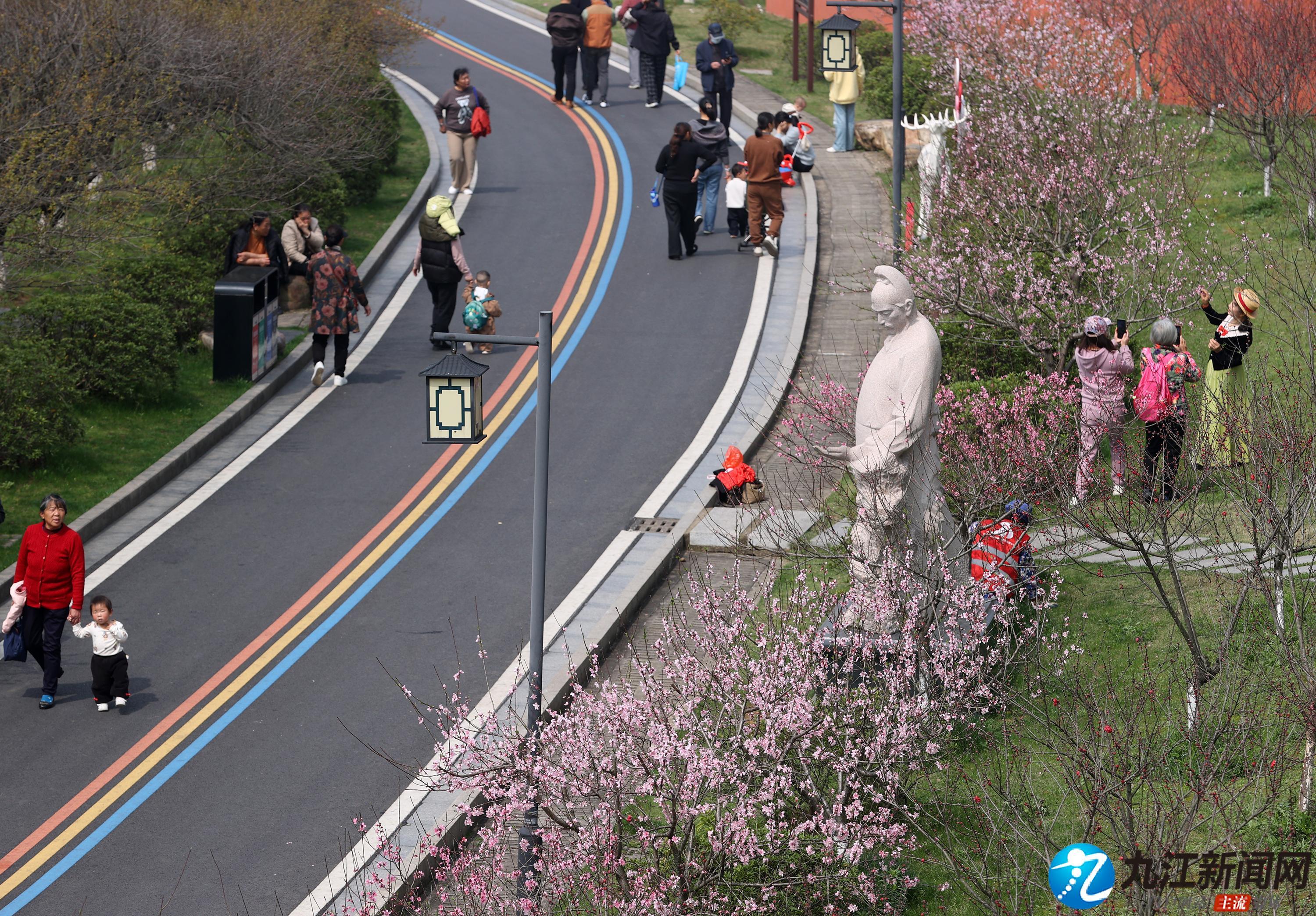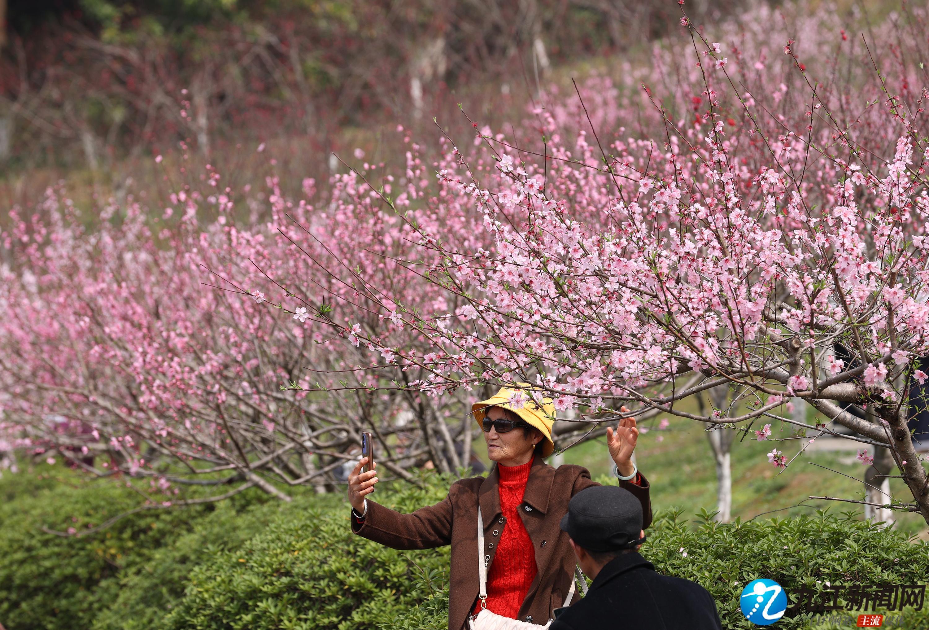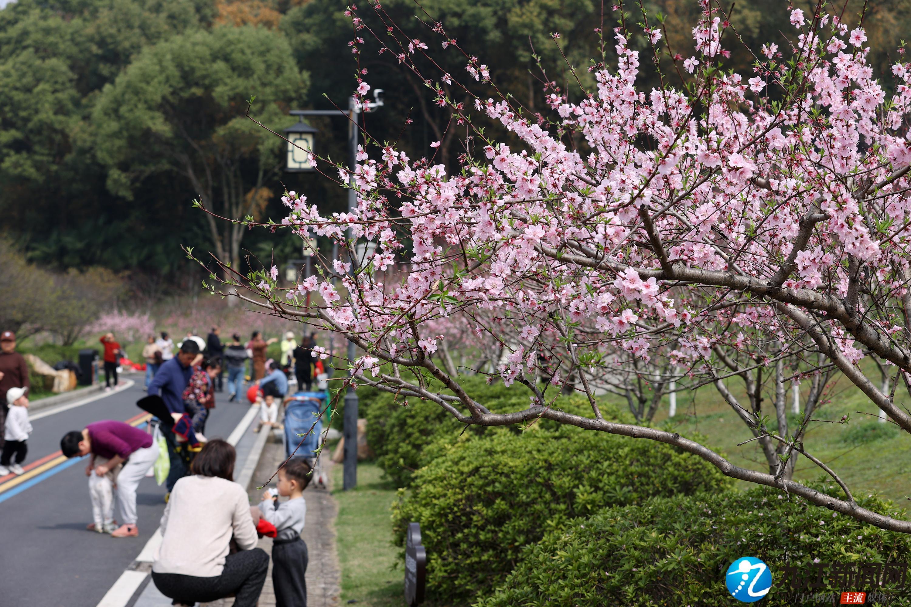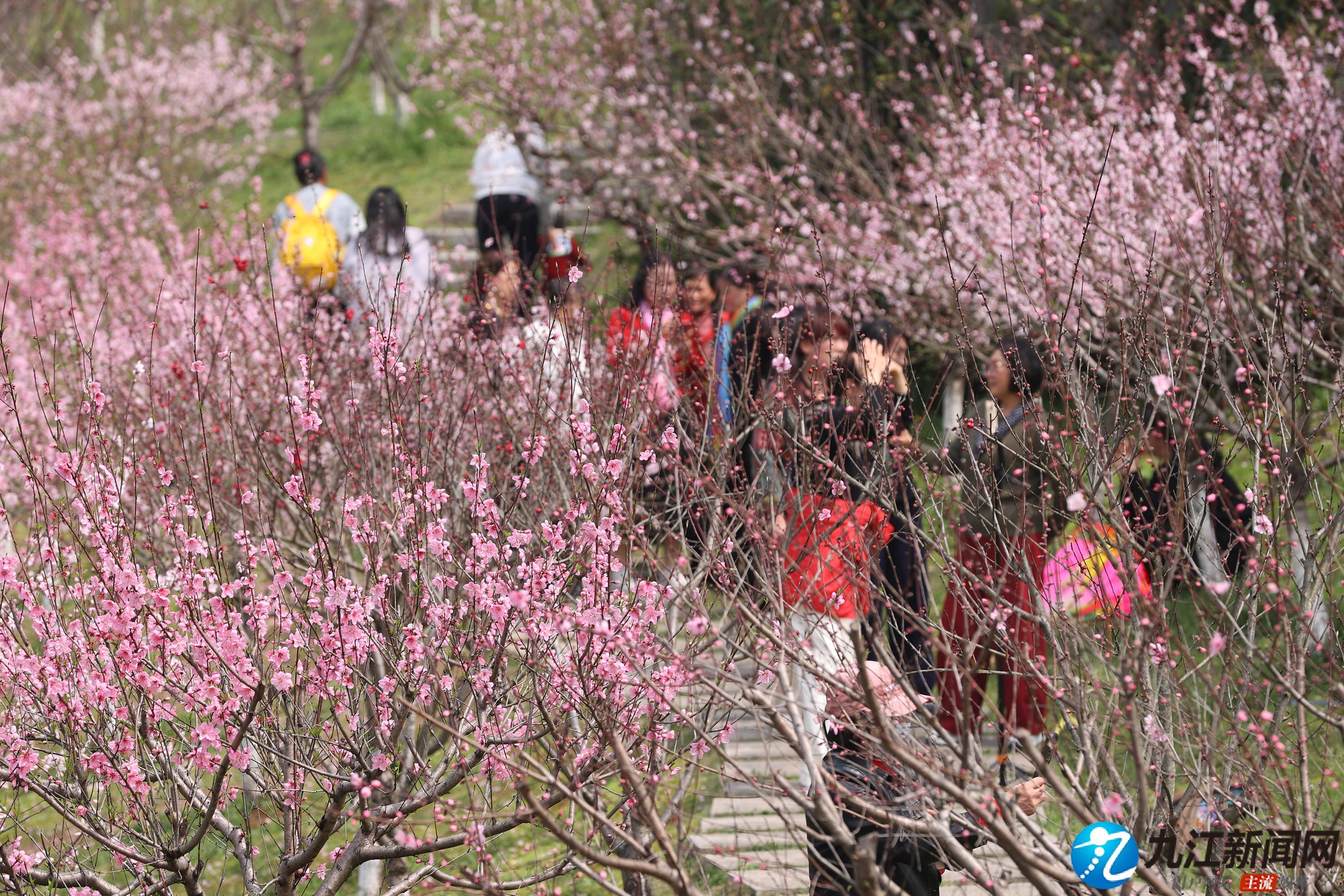 3月25日,南山公园桃园内的桃花绚烂绽放,粉色花海吸引大量市民前来打卡拍照。物候更迭、春光接续,南山公园内梅花谢后樱花绽、樱花掉落桃花开,成为人们踏青赏花的热门地。(九江日报全媒记者 刘家 摄)