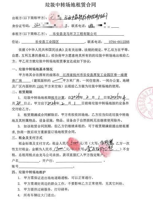 2.网友投诉反映的的场地,正是县龙马公司与(中焱科技现已废弃乐安县山砀镇杏坊村)签订的临时垃圾转运点,并于2026年2月1日签订了场地租赁合同(附图1),并且临时堆放的垃圾在签订范围内。