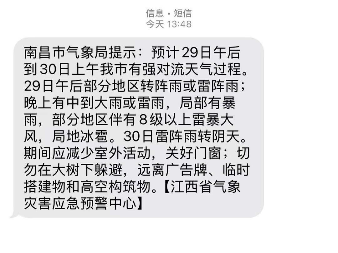 据江西省气象台预测,3月29日至3月30日,江西将迎来今年首场大范围强对流天气,本轮强对流天气影响范围广、移动速度快、致灾风险较高,部分地区累计雨量有30~60毫米,局地超过100毫米,部分地区并伴有强雷电、短时强降水、冰雹和10级雷暴大风。各地需及时做好地质灾害防御、强对流天气灾害防御工作,加强春播春管工作、保障农业生产。