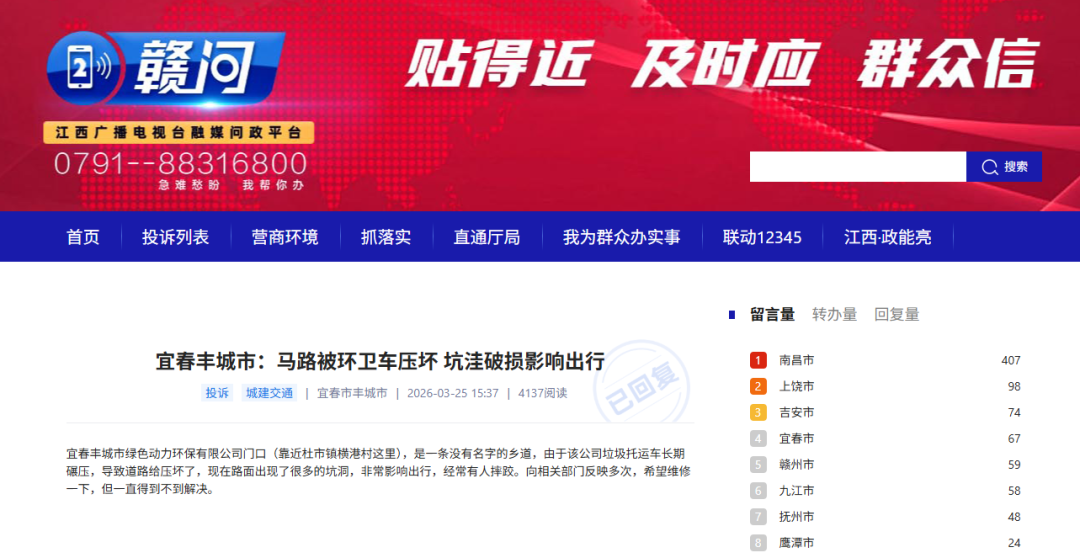 《赣问》平台转来的《宜春丰城市:马路被环卫车压坏 坑洼破损影响出行》问题收悉。
