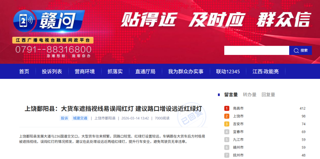 《赣问》平台转来的关于《上饶鄱阳县:大货车遮挡视线易误闯红灯 建议路口增设远近红绿灯》已收悉。