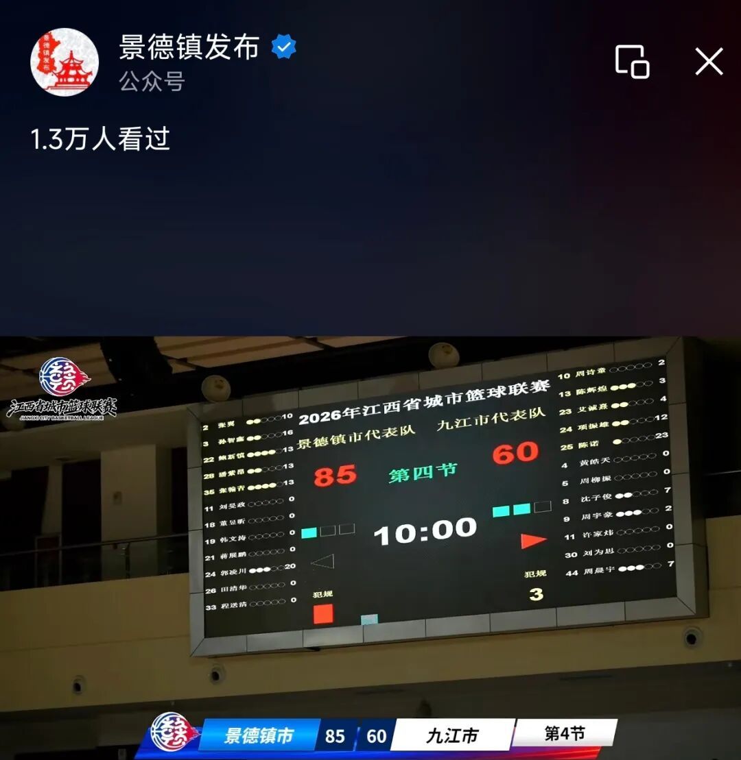 今晚,篮球热潮再度席卷景德镇。景德镇市昌南新区体育馆内灯火通明、人声鼎沸,2026年江西省城市篮球联赛(赣BA)迎来焦点对决——坐镇主场的景德镇队迎战来访的九江队,本赛季赛制为八进四。经过四节激烈鏖战,景德镇队最终以 85:60 力克强敌九江队,取得本场胜利!