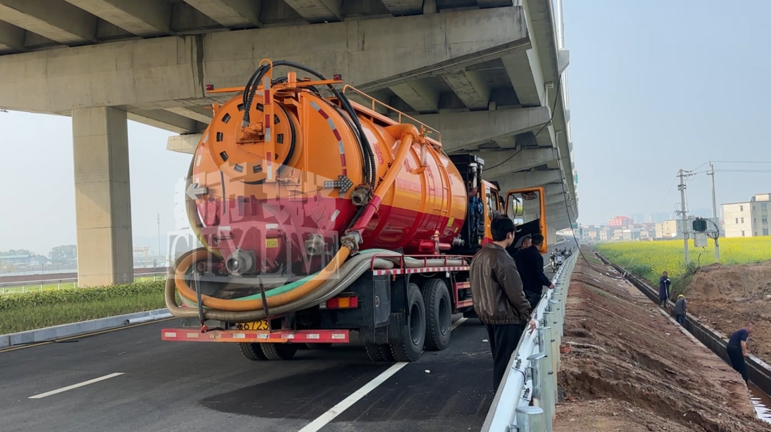 高梧村党支部书记刘花保告诉记者,此前已主动对接中铁大桥局项目部沟通积水处置事宜,对方表示内部正在商议解决方案。记者现场走访期间,中铁大桥局工作人员赶到现场开展处置,多名工人正在清理边沟泥沙,清淤车辆同步进场,并现场敲定作业方案。