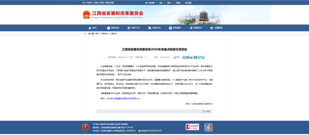 省发展改革委会同省商务厅、省工业和信息化厅正式发布《2026年江西省重点招商引资项目册》,一口气推出600个重点招商项目,总投资高达4363.8亿元,七大领域全面开花,为江西高质量发展再添强劲动能,也为海内外投资者带来满满新机遇。