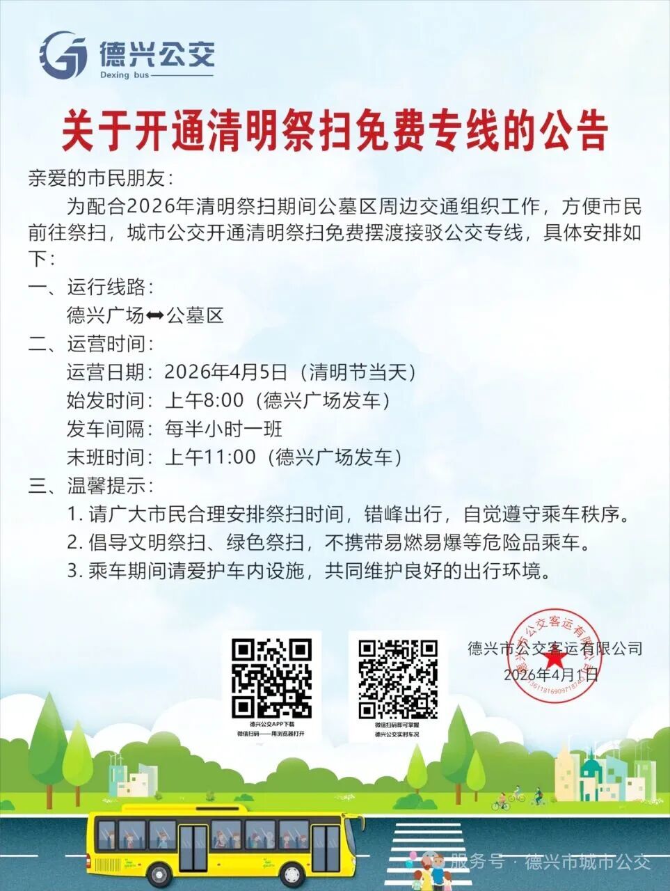 为切实满足2026年清明祭扫期间市民出行需求,优化公墓区周边交通组织,德兴市公交客运有限公司于4月1日发布公告,宣布当日开通清明祭扫免费摆渡接驳专线,以公益服务助力市民文明、便捷祭扫。
