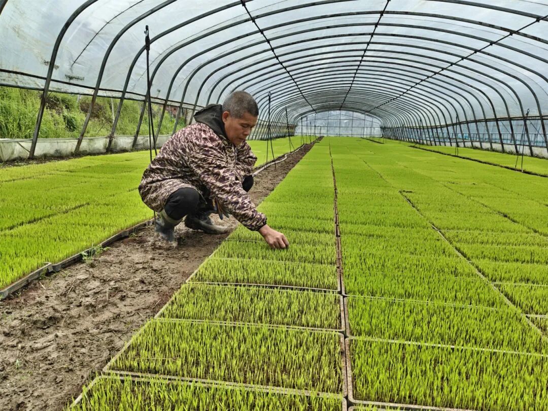 不远处,几名村民正忙着搭建育秧大棚。钟小龙介绍,今年他新添置了全自动育秧流水线、水稻种子催芽机和全自动种子包衣机。“有了这些新设备,育秧的效率和质量都能大幅提升。”目前,秧苗已陆续送入育秧大棚,预计4月上旬可开展机插作业。