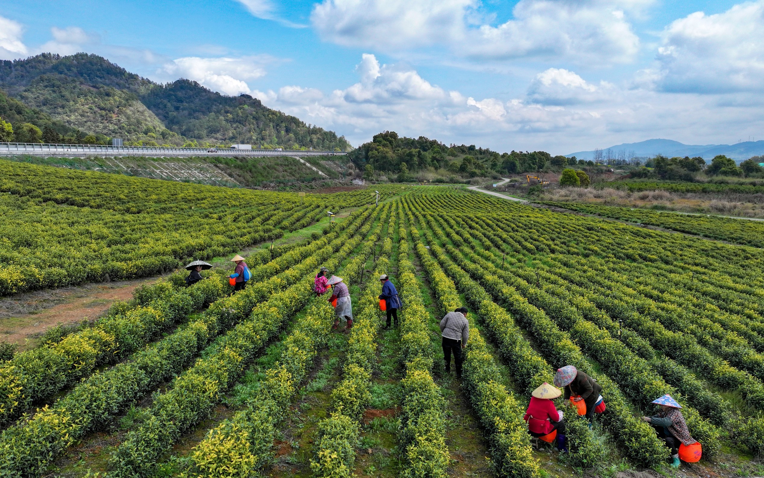 3月27日,分宜县湖泽镇尚睦村百亩黄茶基地,茶农忙着采摘明前茶,准备供应市场。