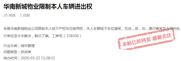 会昌县华南新城物业公司限制本人地下产权车位使用权,本人车辆进出地下车位道闸无法通行,相关执行单位至今未解决,敷衍了事。