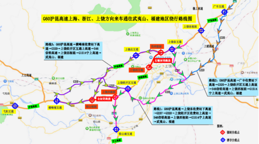 路线:G60沪昆高速→横峰南收费站下高速→G320→上饶经开区收费站上高速→S46信铅高速→上饶西枢纽→G1514宁上高速→去往武夷山、福建方向。