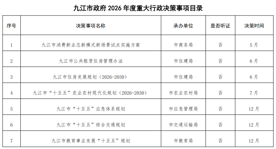 为进一步规范重大行政决策程序,推进政府科学、民主、依法决策,根据《重大行政决策程序暂行条例》(国务院令第713号)和《江西省县级以上人民政府重大行政决策程序规定》(省政府令第247号)要求,经市委市政府同意,现将《九江市政府2026年度重大行政决策事项目录》予以公布,请各承办单位认真组织实施,按要求抓好落实。