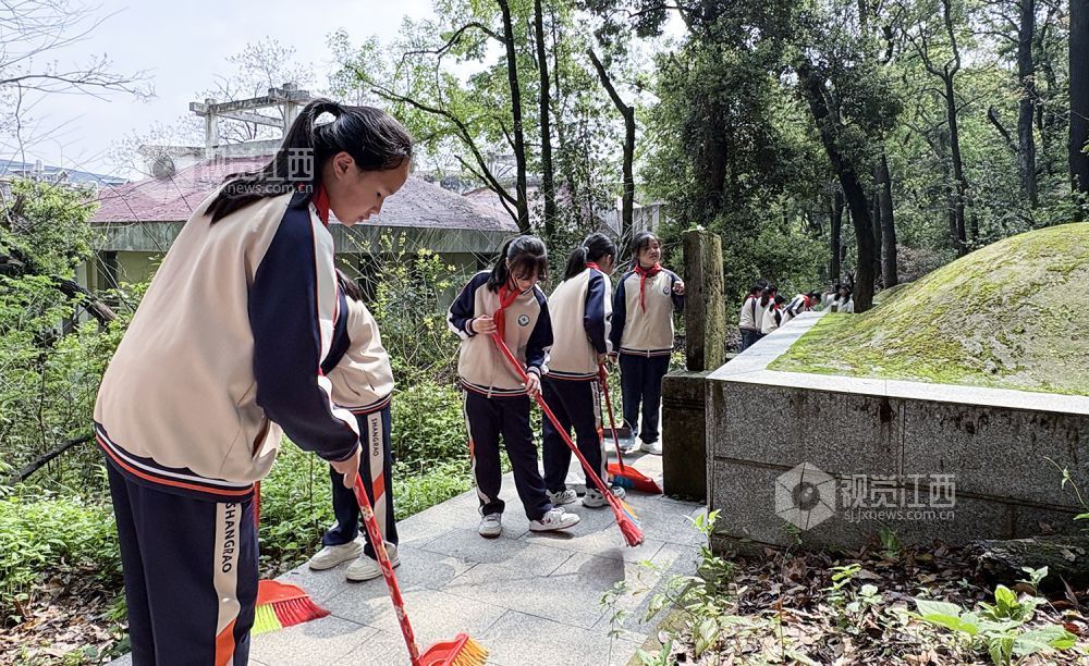 4月1日,江西省余干县东山岭烈士陵园,余干县第五小学学生在烈士陵墓周边打扫卫生。