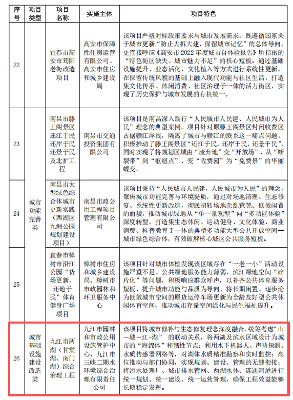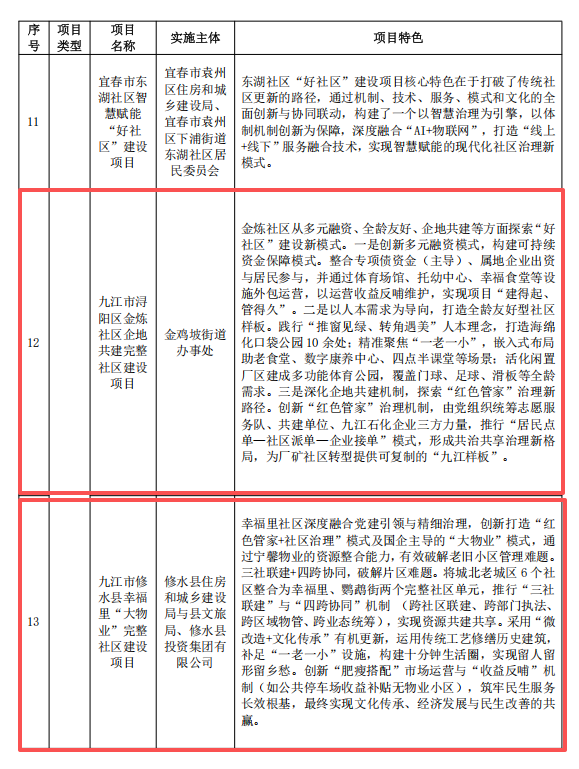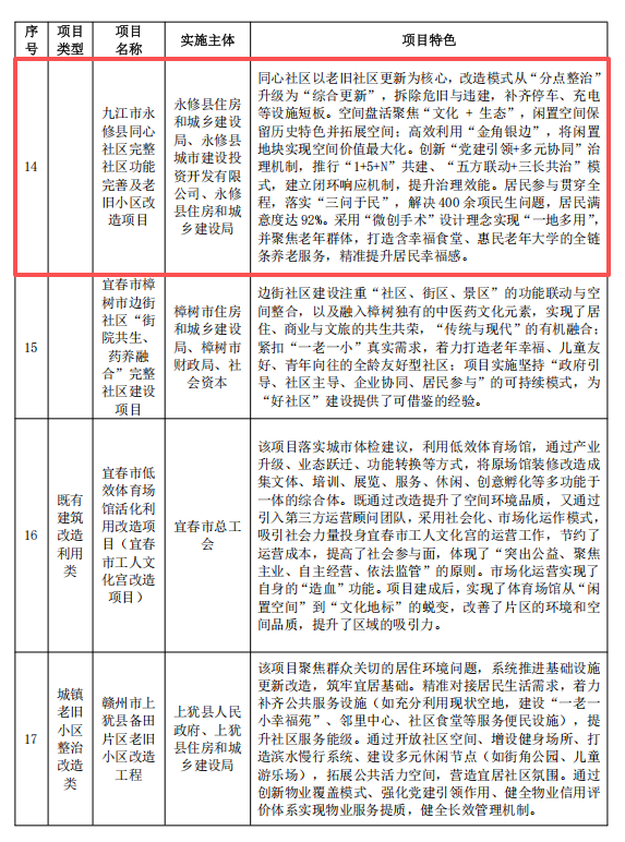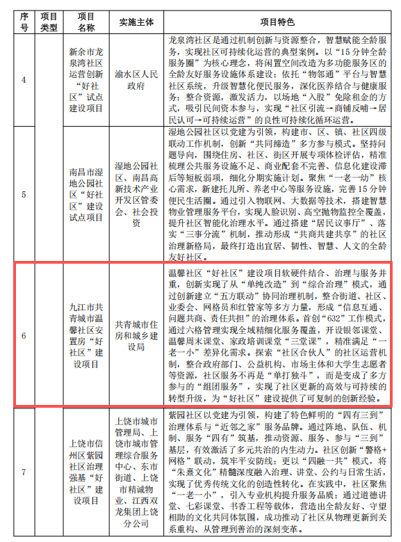 近日,《江西省城市更新暨“好社区”建设典型案例》公布,我市共青城市温馨社区安置房“好社区”建设项目、浔阳区金炼社区企地共建完整社区建设项目、修水县幸福里“大物业”完整社区建设项目、永修县同心社区完整社区功能完善及老旧小区改造项目、两湖(甘棠湖、南门湖)综合治理工程、大中路历史文化街区一期改造提升项目、动力机厂历史文化街区改造项目等7个项目入选。