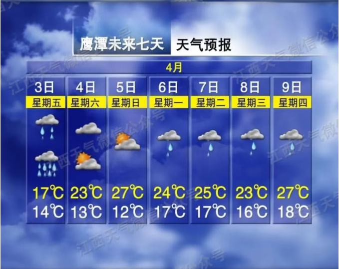 【暴雨黄色预警】4月3日9时30分江西省气象台变更暴雨黄色预警信号:预计未来6小时内,抚州、鹰潭两市和吉安、上饶两市南部及赣州市北部的部分地区降水可达50毫米以上,局地伴有短时强降水、雷电等强对流天气,请注意防范强降雨可能引发的城乡内涝、中小河流洪水、山洪和地质灾害等次生灾害。