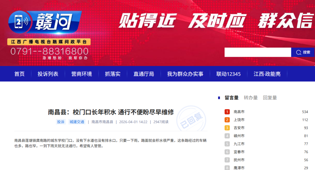 《赣问》平台转来的《南昌县:校门口长年积水 通行不便盼尽早维修》已收悉。