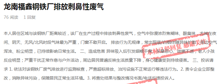2026年3月14日福鑫钢铁厂开工以来,龙南生态环境局多次到企业进行帮扶指导,帮助企业排查异味来源。经查,群众反映的异味问题是由于企业新上设备存在油漆,调试过程中遇到高温时会产生异味,对周边环境存在影响。3月17日,龙南生态环境局对该公司下达了整改通知,要求严格按照环评要求落实好各项环境保护措施。3月19日,龙南生态环境局联合经开区安环办、工信局、龙南镇政府、龙腾社区、企业代表、村民代表在龙腾社区召开了座谈会。目前,企业已查明异味扰民的原因,并制定了相关整改措施,正在整改中。下一步,龙南生态环境局将督促企业按照整改措施落实到位。
