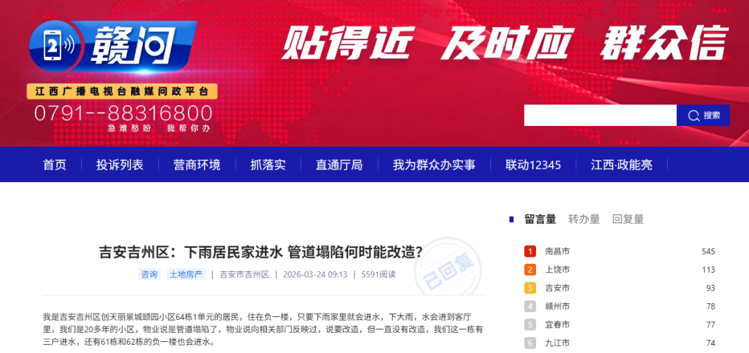《赣问》平台转来的《吉安吉州区:下雨居民家进水 管道塌陷何时能改造?》已收悉。