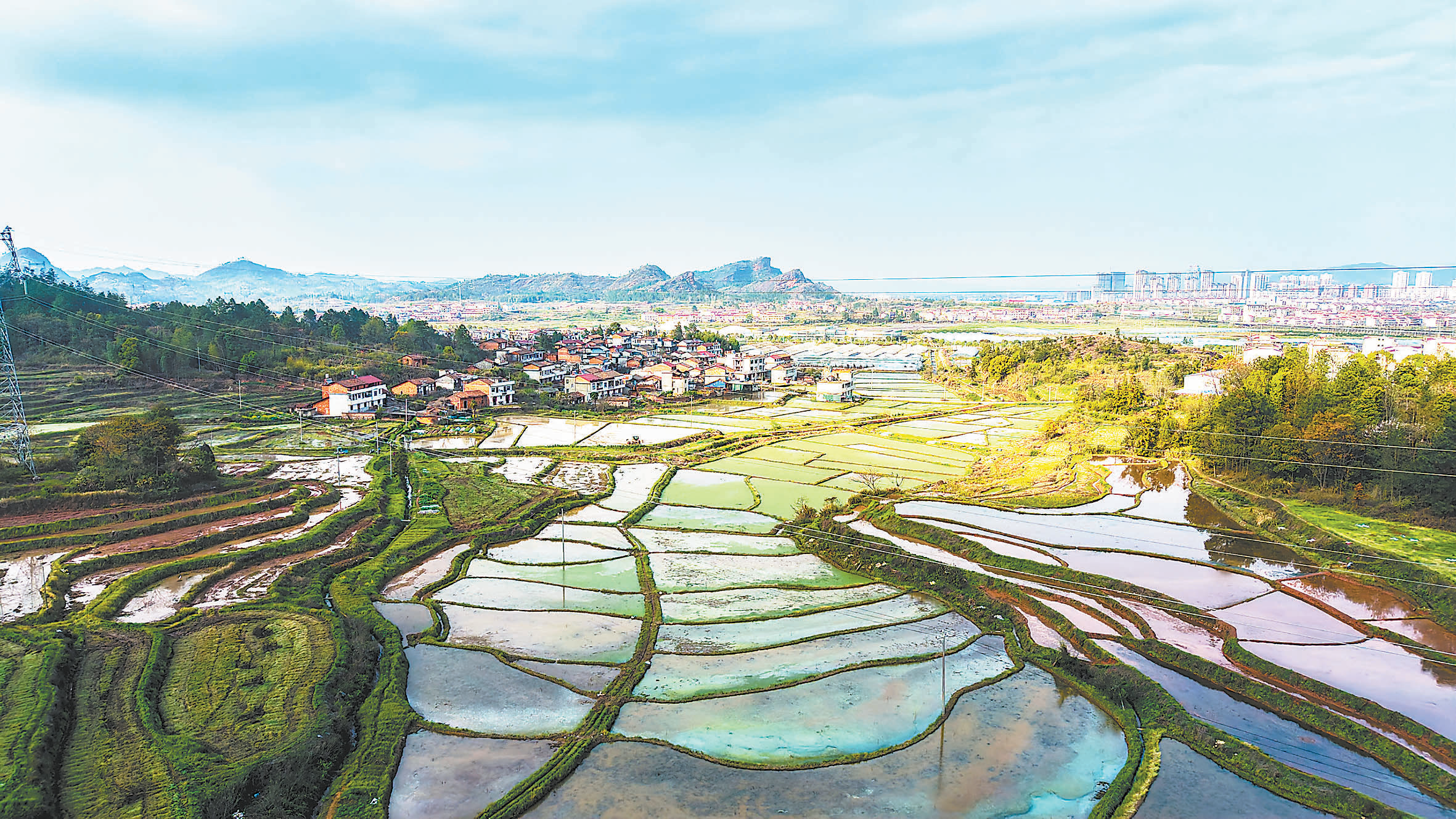 春日时节,南城县建昌镇黄家围村田园风光如诗如画,层层叠叠的梯田与青绿色的田埂勾勒出柔美的曲线,与错落有致的民居相映成趣。远处黛色山峦连绵起伏,城市高楼隐约可见,绘就一幅“山乡与城郭共生、传统与现代交融”的生动画卷。朱光明 摄