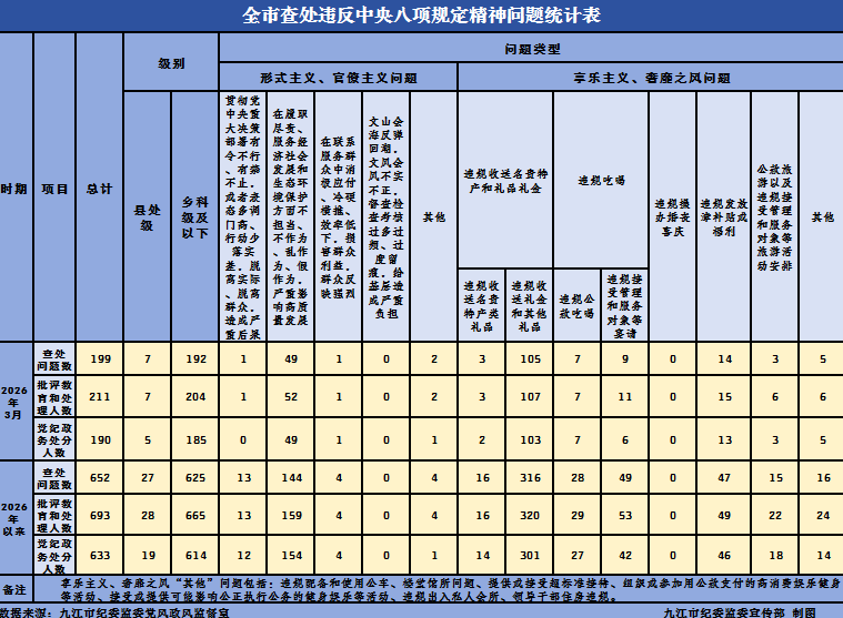 2026年3月,全市共查处违反中央八项规定精神问题199起,批评教育和处理211人,其中党纪政务处分190人。
