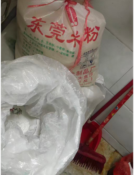 食品原料与清扫工具混放无防潮设施,从业人员未戴口罩。