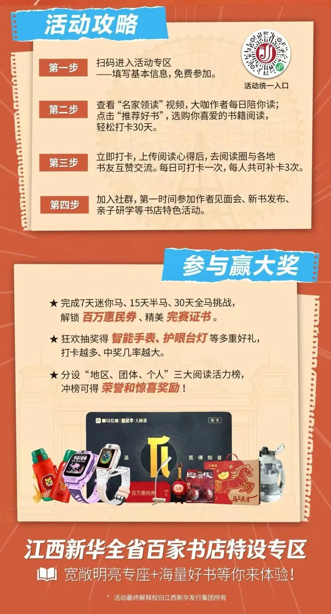 活动参与者可在全民阅读马拉松线上平台免费报名,读者个人累计阅读打卡完成10天,可解锁对应奖励,排行前十的读者将评选为“阅读推广之星”,颁发证书。