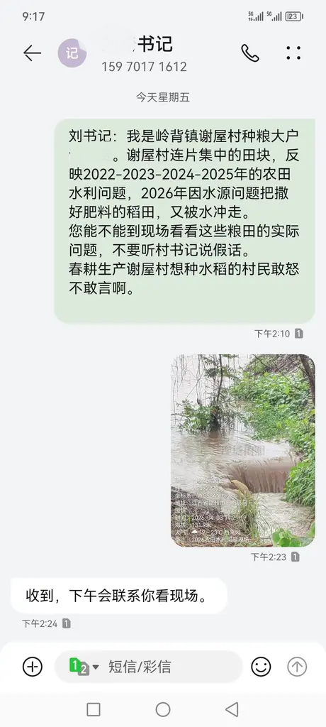 4月3日下午,我镇党委书记收到短信后,第一时间组织人员到现场核实。针对实际情况和存在问题,制定了解决措施:由谢屋村委会安排专业人员在水渠入口处安装手摇式闸门,日常保持开启保障农田正常灌溉,遇暴雨、大坝河水位较高时及时关闭,阻断河水进入水渠淹没农田。同时,第一时间组织农技人员到田间协助网友做好农田清淤、补肥等补救工作,全力降低种植损失。