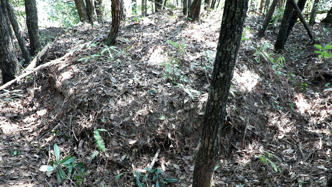 该碉堡遗址坐落于海拔630米的梧风洞梨树山陡峭山顶,占地面积约20平方米。遗址外围环绕着一道宽约1米的环形战壕。因长年雨水冲刷,壕沟内淤积了大量泥土与落叶,现存可见深度约0.6米。据当地护林员李小忠回忆,四十余年前他曾到此巡查,当时战壕深度仍有约1米,工事形制保存更为完整。