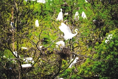 4月9日,青山湖区天香园春意盎然、生机勃发。园内迎来大批白鹭、夜鹭、牛背鹭等夏候鸟,它们在林间飞舞,筑巢繁衍。