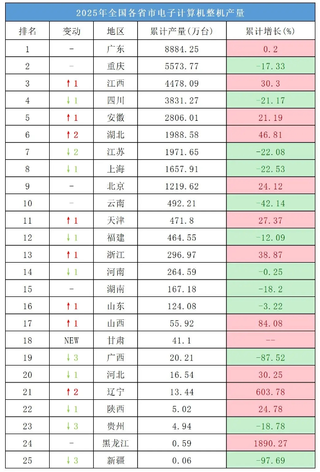 江西计算机制造今年也迎来了自己的高光时刻。2025年全年产量,江西以4478.09万台超过四川,全国计算机产量“前三甲”有江西。