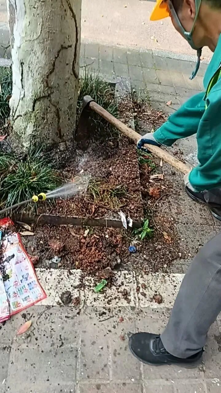 我中心园林组工作人员到现场巡查,针对被白蚁侵害行道树进行喷药处理(附现场作业图片)。