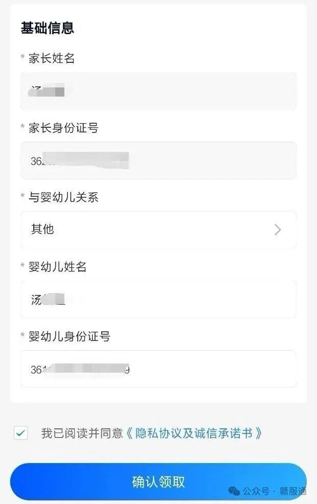 4.上传“婴幼儿户口本内页”,填写相关信息(含婴幼儿姓名及身份证号、领券人姓名及身份证号信息)。填完信息确认无误后,点击确认领取后完成申请。