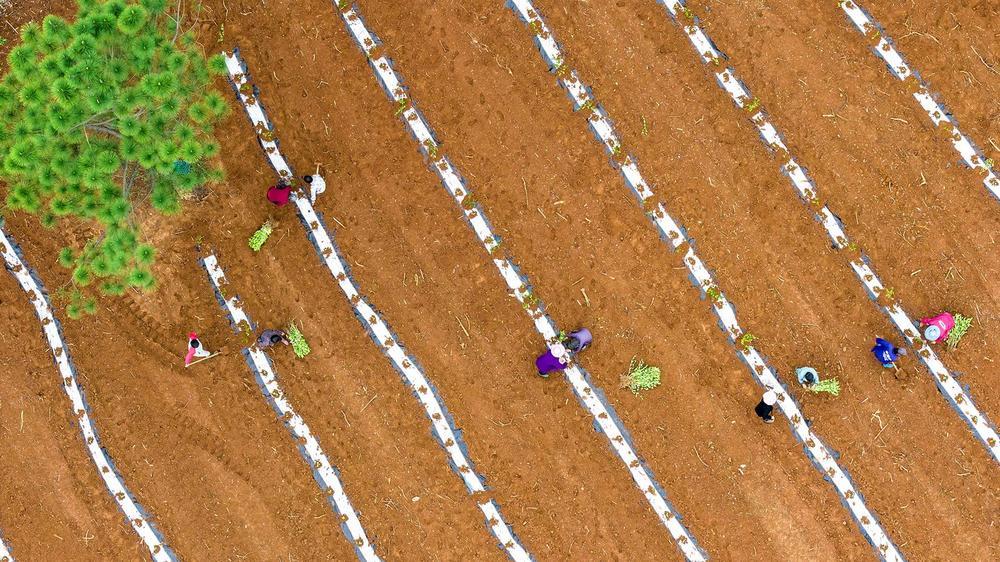 春耕时节,樟树市义成镇淖港村农民抢抓农时,开展黄栀子苗种植与西瓜苗套种作业,田间地头一派繁忙景象。