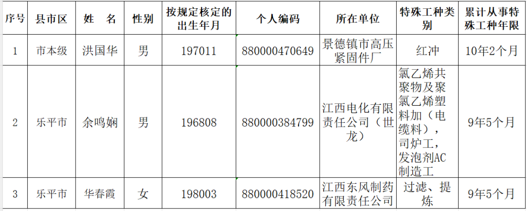根据江西省人力资源和社会保障厅《关于规范企业特殊工种提前退休审核确认流程有关问题的通知》(赣人社字〔2019〕41号)规定,现将景德镇市拟办理特殊工种提前退休手续职工名单予以公示,公示时间为5个工作日,请社会各界监督。如有异议,请在4月17日前向景德镇市人力资源和社会保障部门反映。