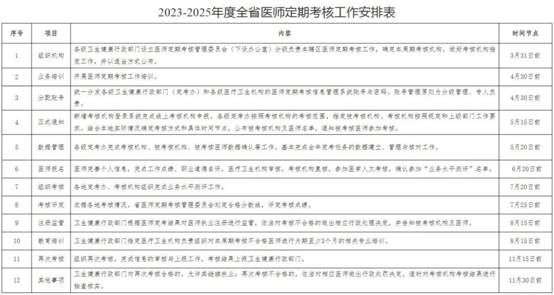 2026年4月底前,启动2023-2025年度全省医师定期考核工作;2026年8月底前,完成2023-2025年度全省医师定期考核主要工作,各级卫生健康行政部门根据医师定期考核结果对医师执业注册进行监管;2026年11月底前,全面完成本周期医师定期考核工作。(具体工作安排见附件1)