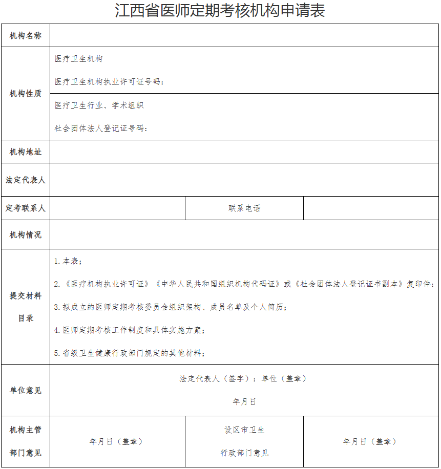 拟向所属卫生健康行政部门申报考核机构的医疗卫生机构或者医疗卫生行业、学术组织,须符合《医师定期考核管理办法》第七条医师定期考核机构条件,填写《江西省医师定期考核机构申请表》(见附件2)报送至所属卫生健康行政部门。上一周期被确定为医师定期考核机构的单位将自动延续为本周期考核机构,无需再次申报。如放弃本周期考核机构资格的单位,应向所属卫生健康行政部门提出书面申请。