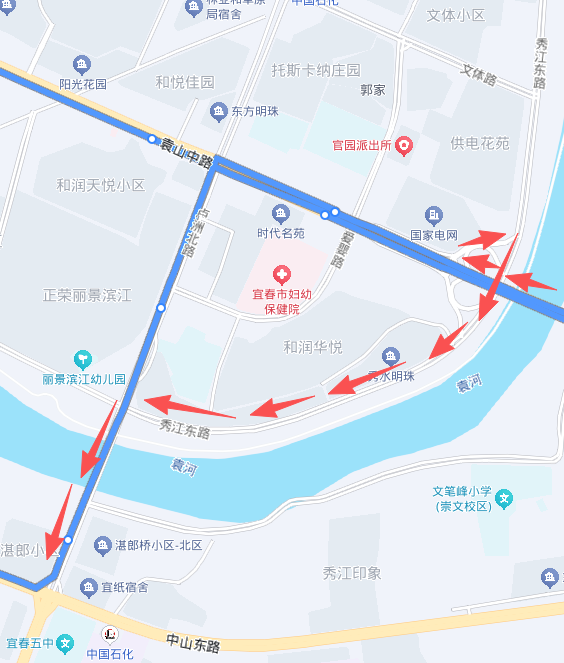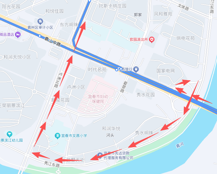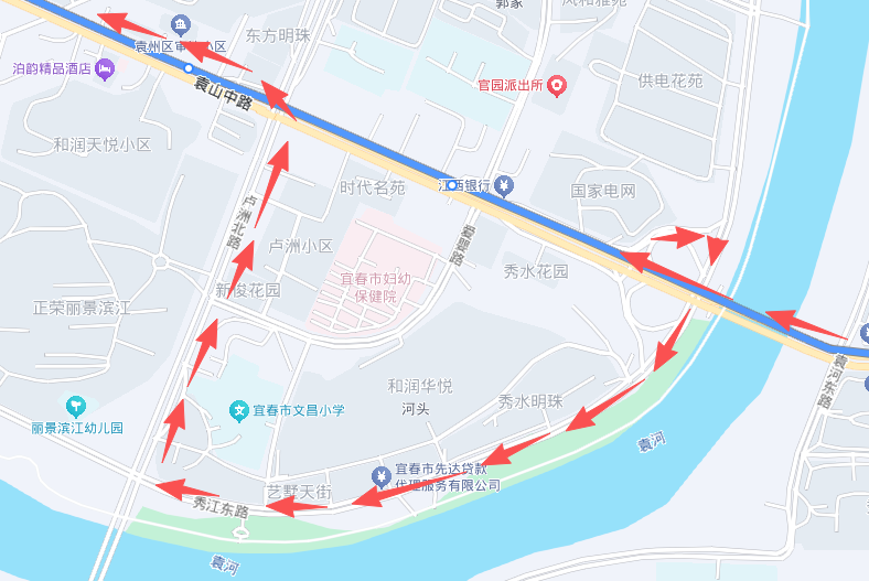 调整走向:宜春站→袁州公园→区行政中心南→嘉晨东郡,绕行秀江东路、卢洲北路后接原线路运行。