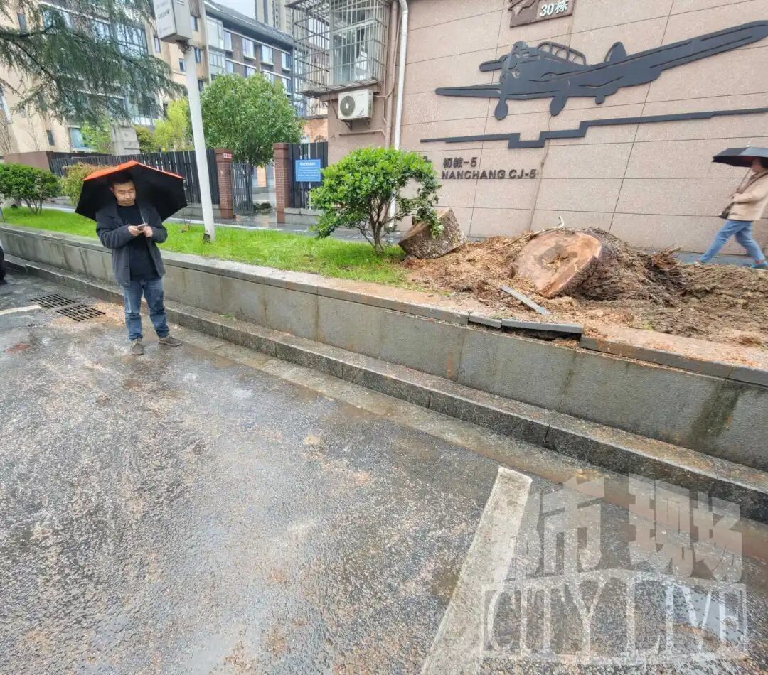 李勇兵解释说,这些树以前属于洪都老厂,地势比较高,后来城市扩容,马路比树根低了约50公分,导致根部受伤,近期雨水多,土壤泡软,树就倒了。